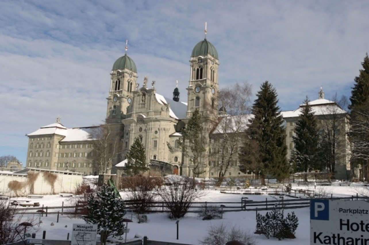 Origen del santuario: la presencia de un santo ermitaño del siglo IX, San Meinrad, mártir. La imagen que se venera es de una Virgen negra del siglo XV. Es lugar de encuentro para los peregrinos de Santiago de Compostela. Actualmente es un amplio monasterio benedictino, frecuentado por numerosos cristinos reformados de la región. El Papa Juan Pablo II lo visitó como peregrino del 14 al 16 de junio de 1984.La fiesta del santuario se celebra el 15 de agosto. Todos los días a las 16,20 h, se canta la Salva Regina, siguiendo una antigua melodía.